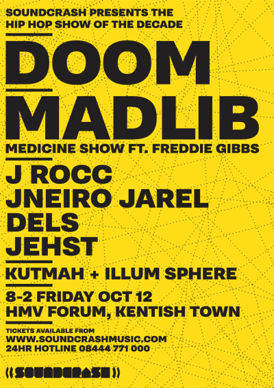 I booked tickets for last nights show at the HMV Forum over six months ago. DOOM, Madlib, J-Rocc, Jneiro Jarel, Jehst, Dels, Kutmah, Illum Sphere. Heck of a line-up. This was going to be big, Soundcrash were billing it as the hip-hop show of the decade.